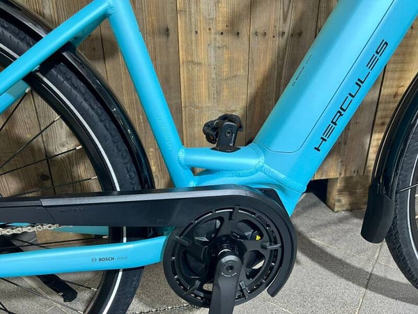 The upright riding position is complemented by practical everyday components: 8-speed derailleur gears and hydraulic disc brakes, ideal for city traffic and recreational rides.